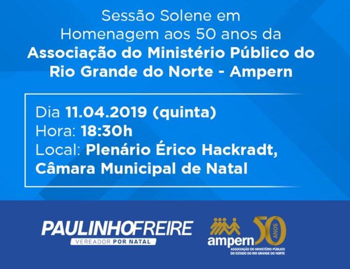 Com propositura do vereador Paulinho Freire, a Câmara Municipal de Natal realiza uma homenagem pela passagem do Jubileu de Ouro de fundação da Associação do Ministério Público do Rio Grande do Norte (AMPERN). A sessão solene será nesta quinta (11), às 18h30, no Plenário Érico Hackradt, onde serão homenageados vários fundadores da entidade. De acordo com o vereador e presidente da Casa Legislativa, Paulinho Freire, a sessão solene será um importante momento para celebrar o trabalho realizado pela instituição. “ A AMPERN sempre buscou contribuir de forma decisiva para a construção e engrandecimento da classe com a luta pelos seus direitos e a defesa da autonomia do Ministério Público potiguar. Devemos prestigiar os esses importantes profissionais que atuam arduamente na defesa da justiça”, completou Paulinho.