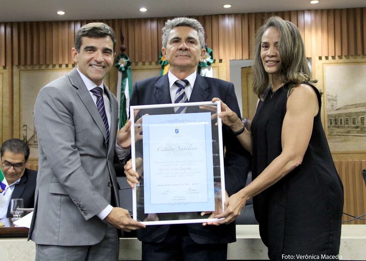 “Fico orgulhoso pela homenagem e pela bondade da Câmara Municipal pela honraria”, disse o homenageado José dos Santos Figueiredo, que na noite desta quarta-feira (17), recebeu o Título de Cidadão Natalense, por proposição do vereador Fúlvio Saulo (SD). Natural da cidade de Ouro Branco, na região do Seridó, o professor de Educação Física que vive em Natal desde 1972 - quando veio concluir os estudos no colégio Atheneu e se preparar para o vestibular - foi responsável por treinar diversas figuras importantes do atletismo potiguar, como é o caso da sua esposa e também atleta, Magnólia Figueiredo, que agradeceu a homenagem. “É um reconhecimento pelos serviços prestados a Natal não só como professor e treinador, mas como também pelo ser humano que ele é. Então pra gente é uma alegria, principalmente por todo o trabalho realizado por ele no social”, disse Magnólia Figueiredo.