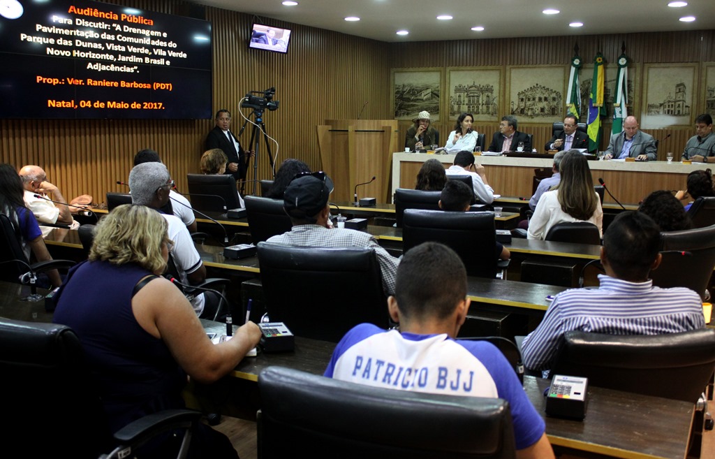Em dias de chuva a situação de algumas localidades da zona Norte se torna crítica devido à falta de drenagem e pavimentação. São alagamentos que se formam com lama misturada a lixo e esgoto, propiciando a infestação de insetos e doenças. Sobre essa problemática, a Câmara Municipal de Natal realizou audiência pública, proposta pelo presidente da casa, vereador Raniere Barbosa (PDT), com a participação de lideranças comunitárias, moradores, vereadores, estudantes e secretários municipais.