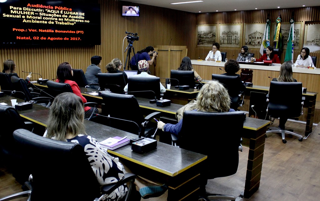 Dentro das discussões abordadas no "Agosto Lilás", período do ano dedicado ao debate mais intenso em torno da proteção a mulher, a Câmara Municipal de Natal realizou nesta manhã (2) uma audiência pública para discutir o assédio sexual e moral contra as mulheres no ambiente de trabalho. A proposição foi da vereadora Natália Bonavides (PT), em parceria com o Programa de Qualificação do Servidor (Proqualis) da Casa. Na ocasião, foi anunciada a campanha "Aqui é lugar de mulher", iniciativa do mandato da parlamentar.