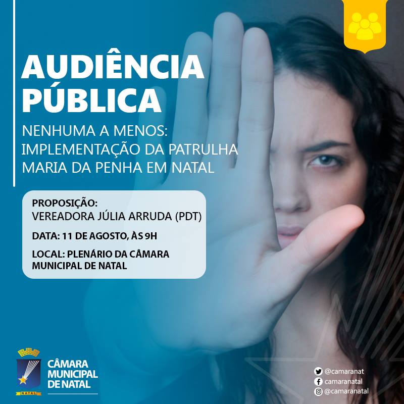 Para discutir a questão, a Câmara Municipal realizará, nesta sexta-feira (11), às 9h, audiência pública com o tema “Nenhuma a Menos: Implementação da Patrulha Maria da Penha em Natal”. Na ocasião, instituições, representantes do Poder Público e movimentos sociais que atuam na defesa dos direitos das mulheres irão debater propostas e compartilhar experiências quanto à necessidade de criação da Patrulha Maria da Penha.