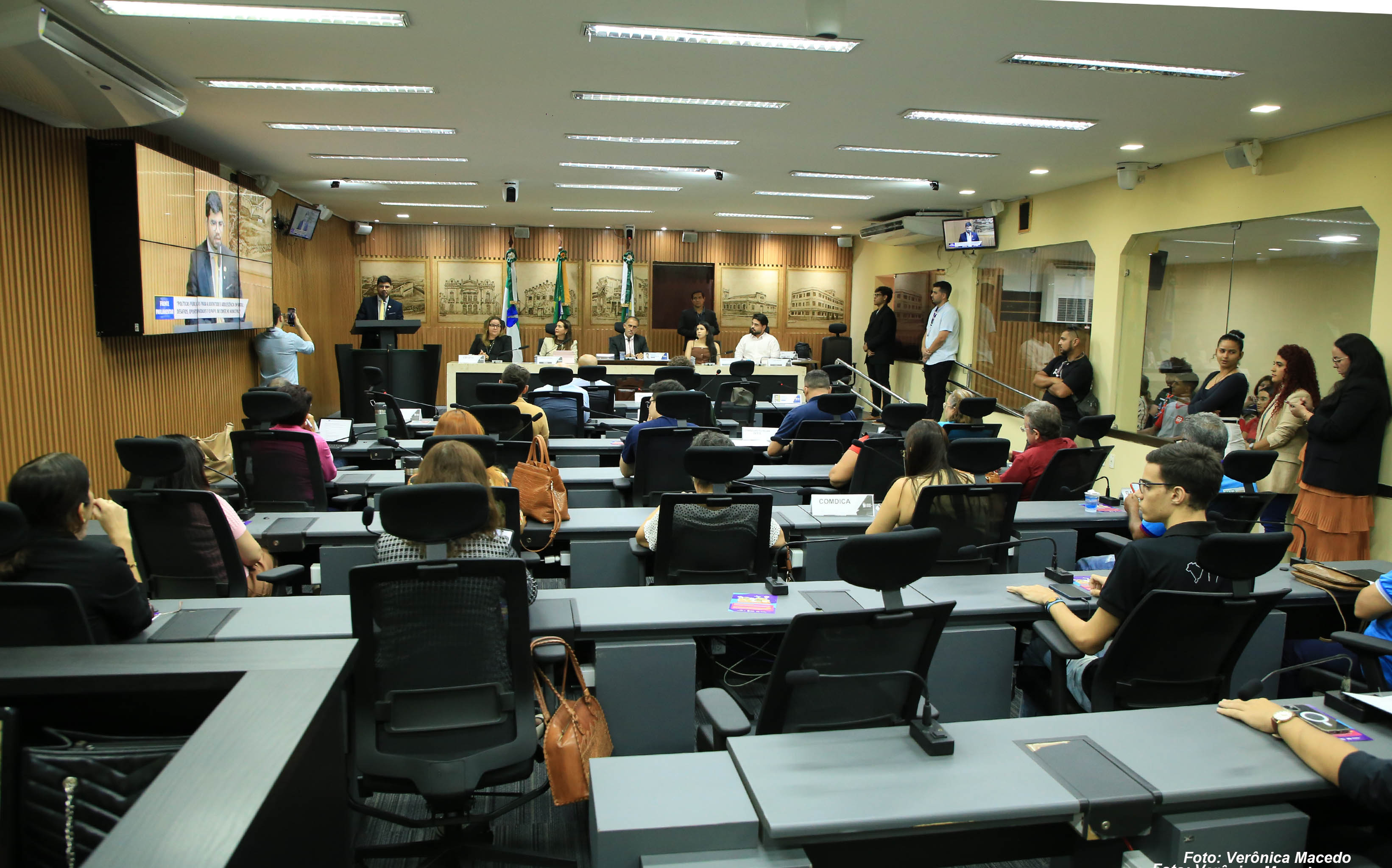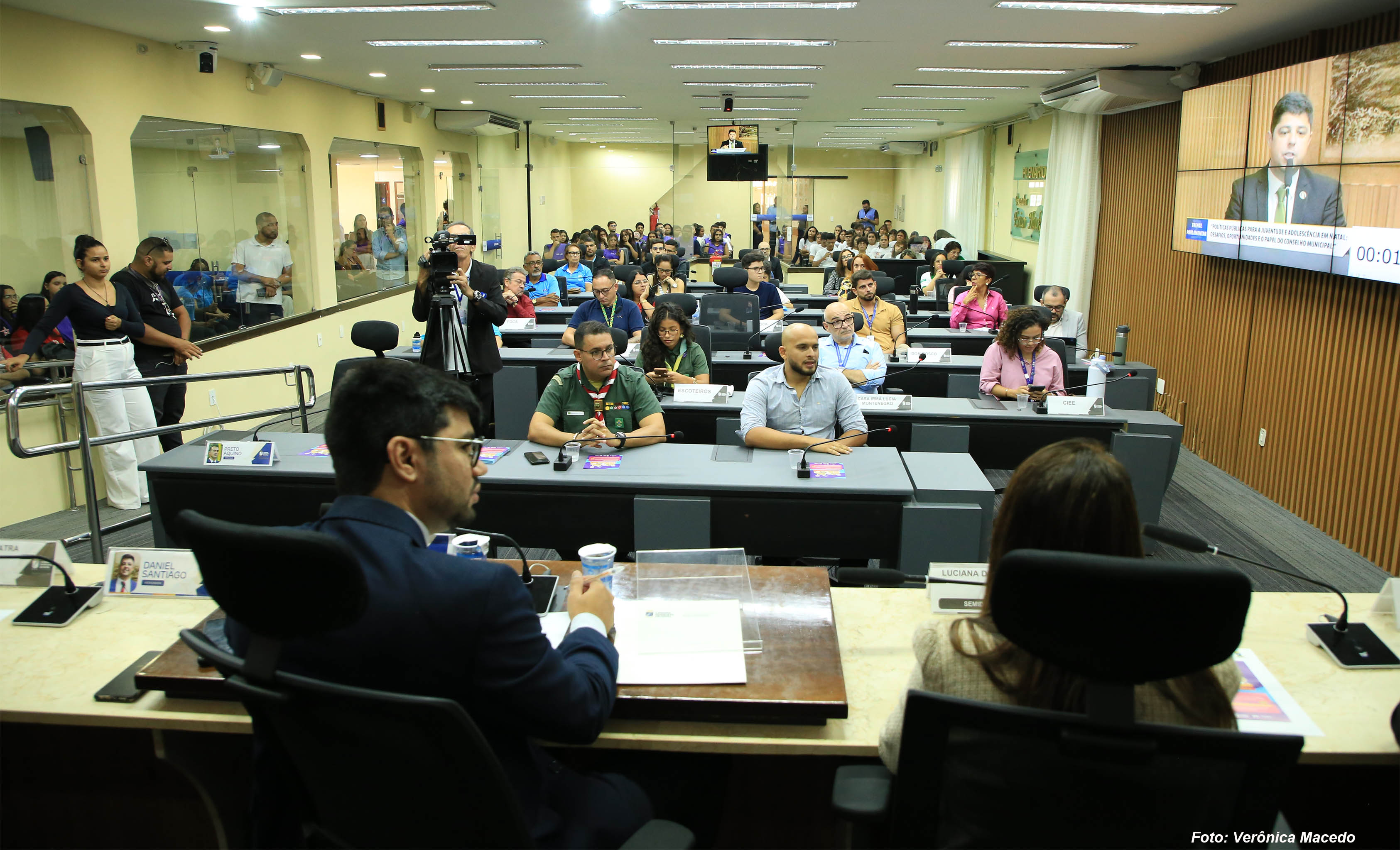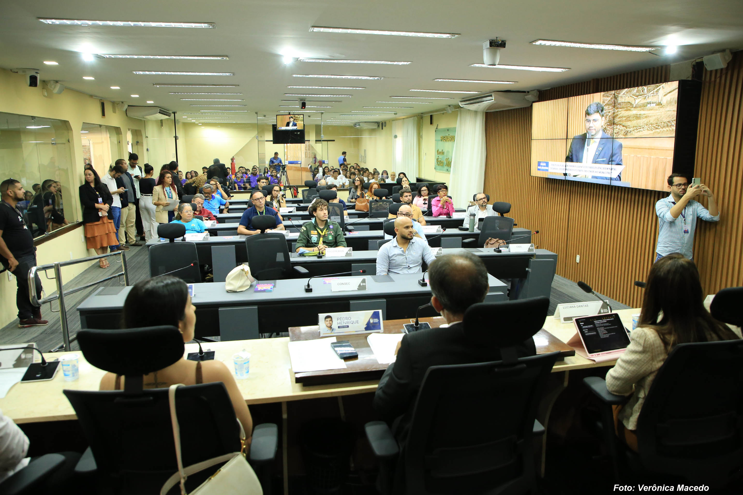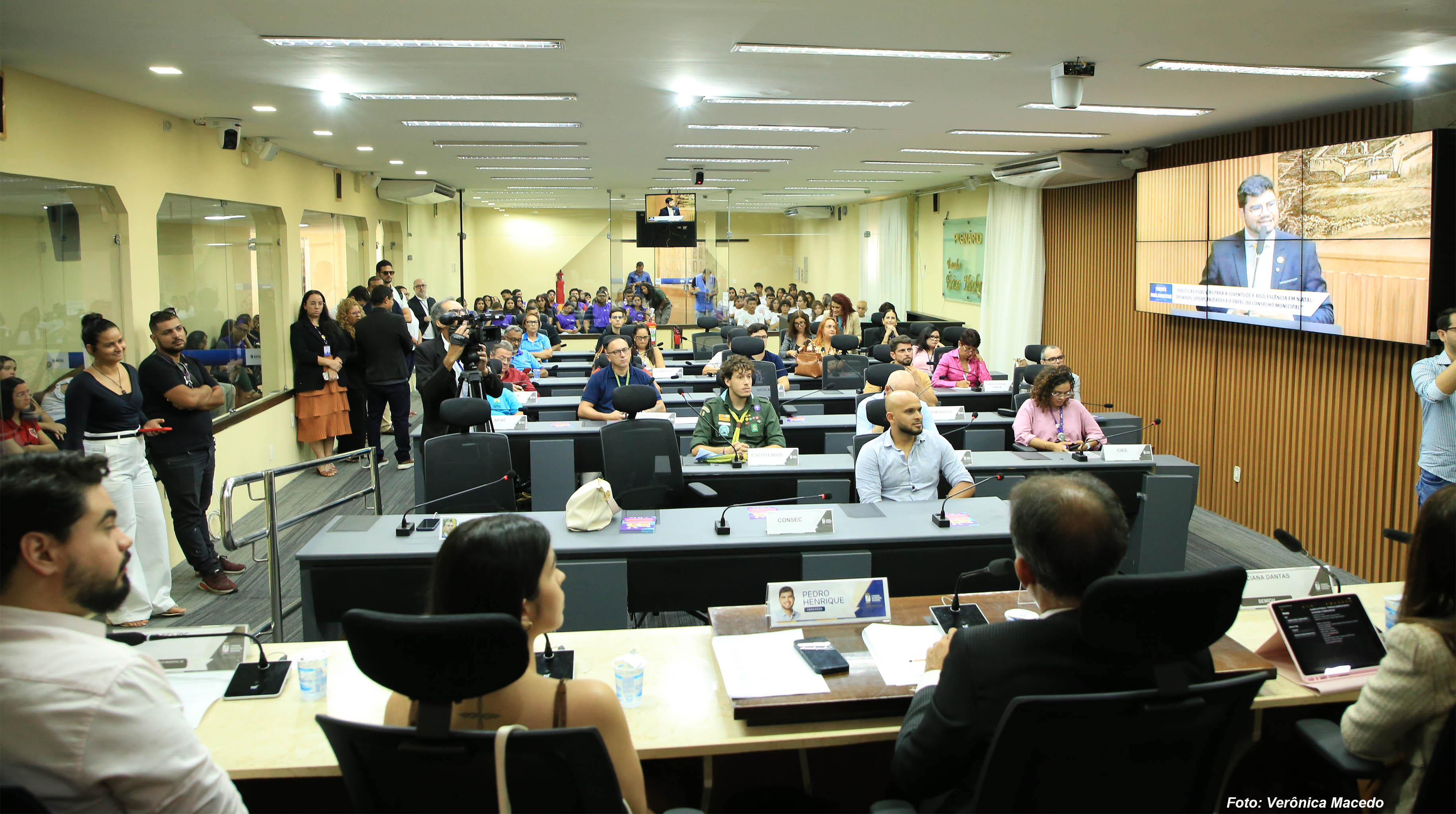 O plenário Érico Hackradt, da Câmara Municipal de Natal, foi palco para a discussão de políticas públicas voltadas para a juventude natalense na tarde desta quinta-feira (26). Foi a primeira audiência da Frente Parlamentar em Defesa dos Direitos da Criança e do Adolescente, presidida pelo vereador Pedro Henrique (PP), e cujo tema foi “Políticas Públicas para a Juventude e Adolescência em Natal: desafios, oportunidades e o papel do Conselho Municipal”. O evento contou com a presença de autoridades da Secretaria Municipal de Direitos Humanos de Natal, do Tribunal de Justiça do Rio Grande do Norte, do Conselho Estadual da Juventude do RN, além de representantes de organizações da sociedade civil e de adolescentes, que ocuparam as galerias da Casa Legislativa.