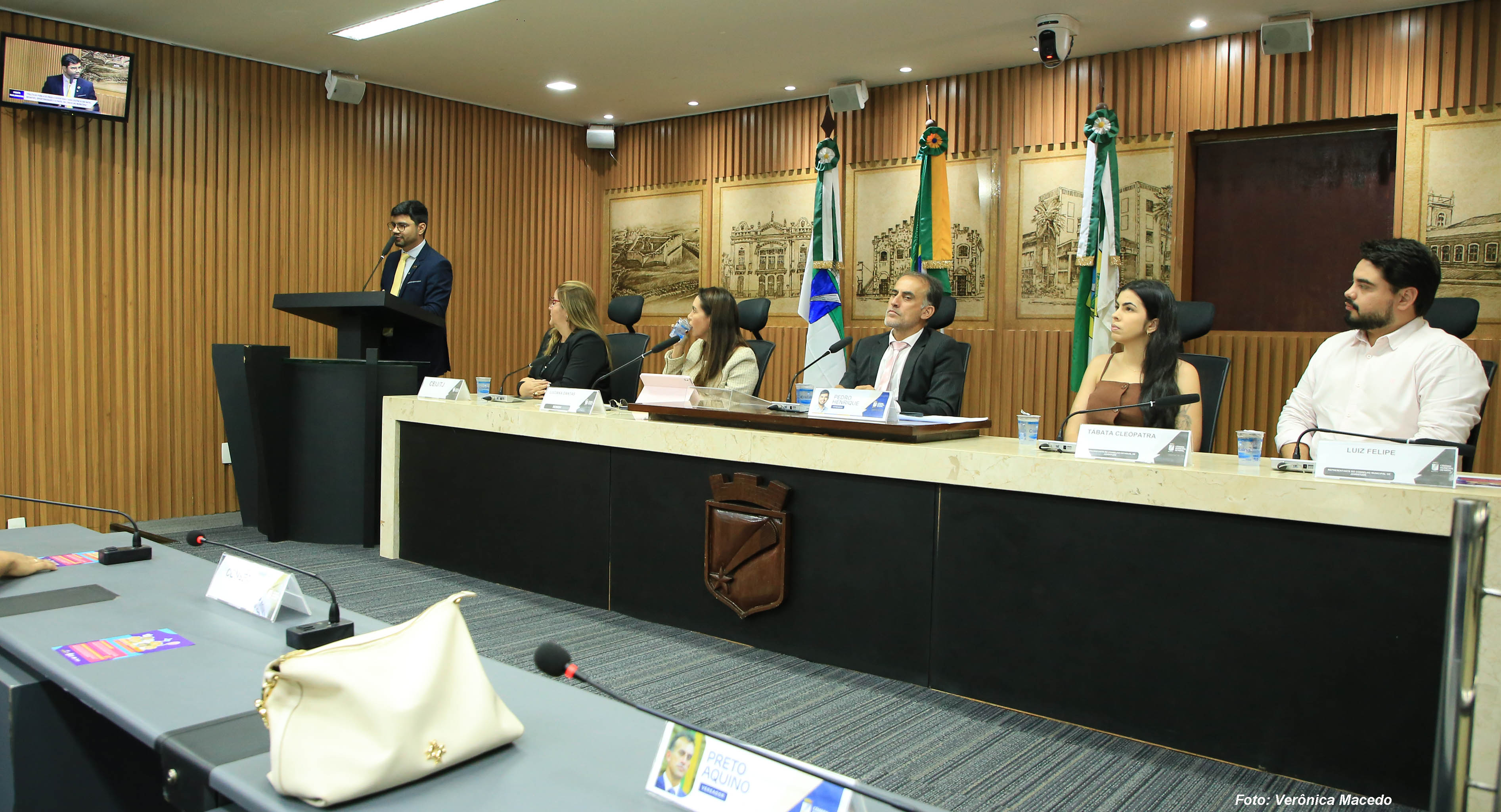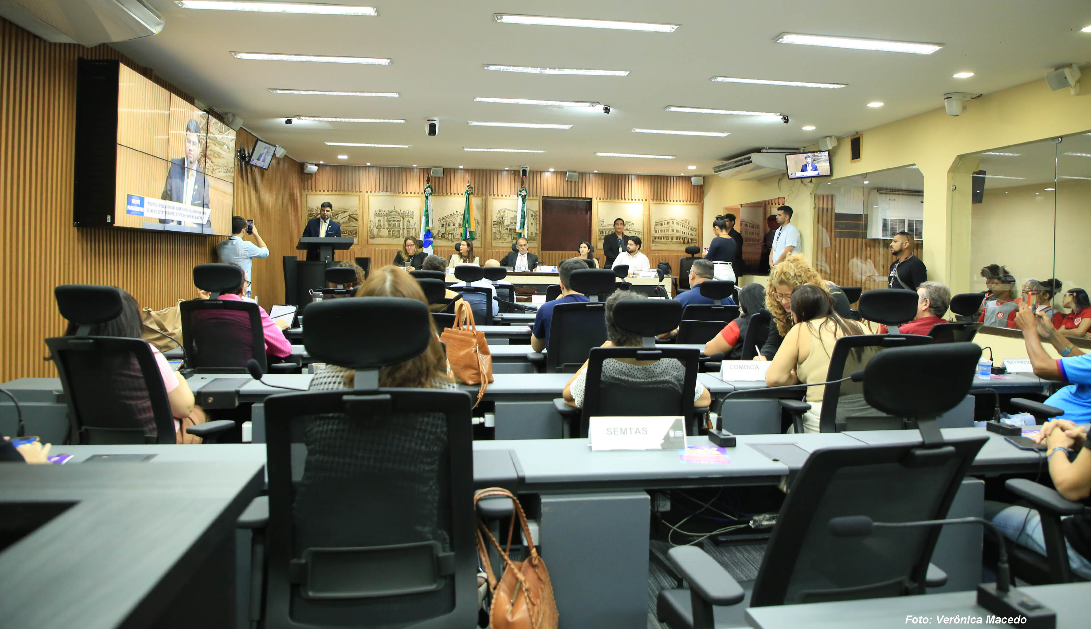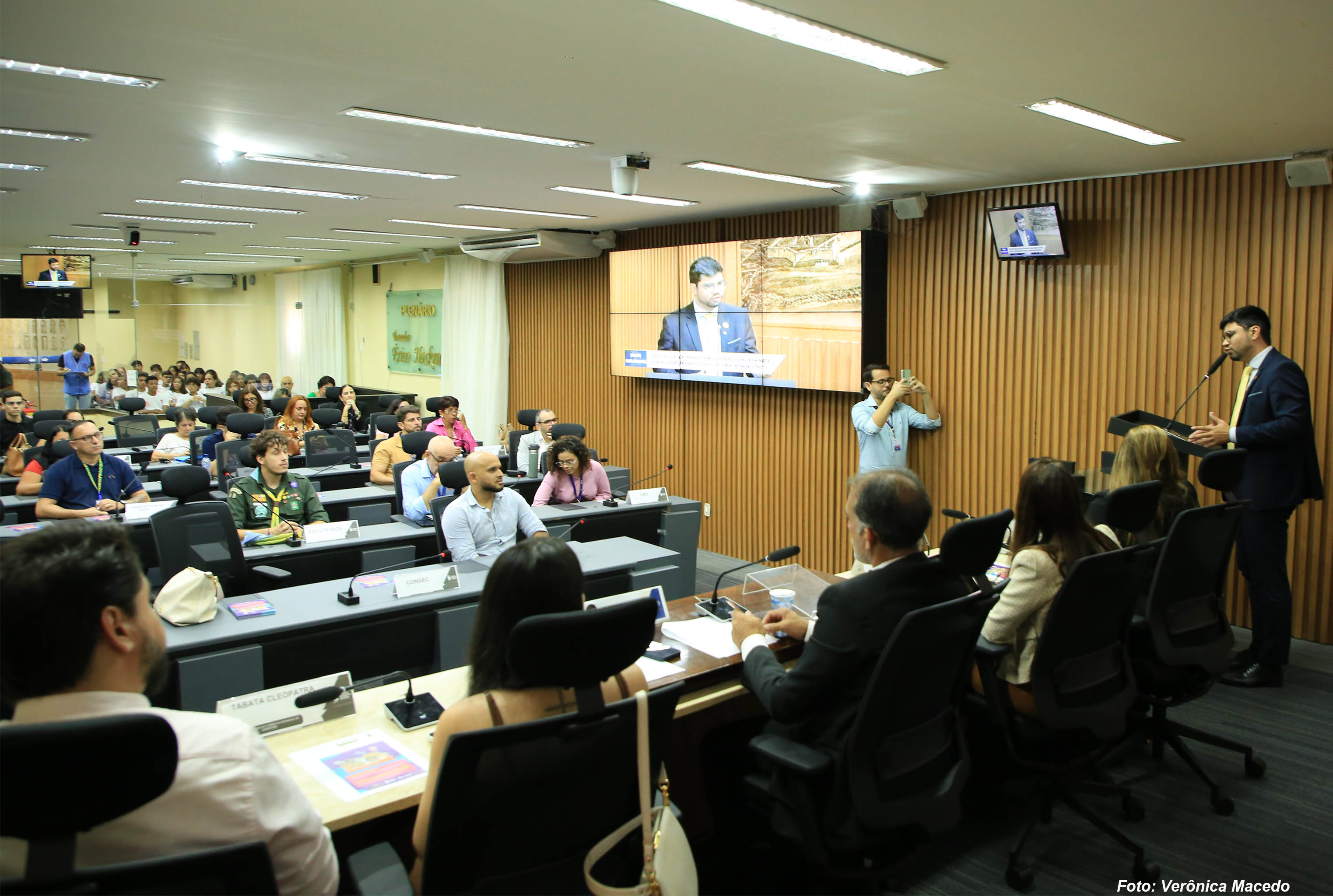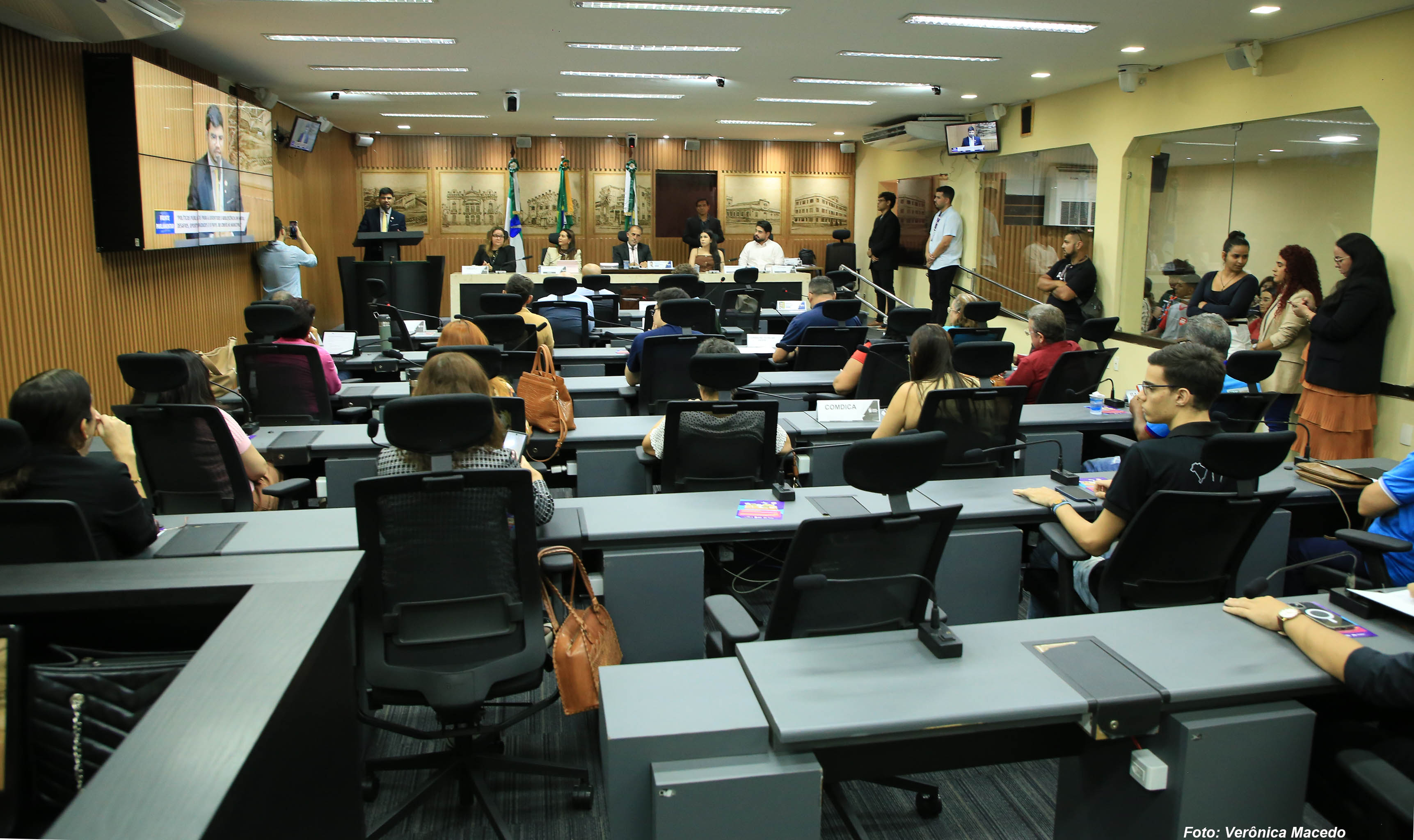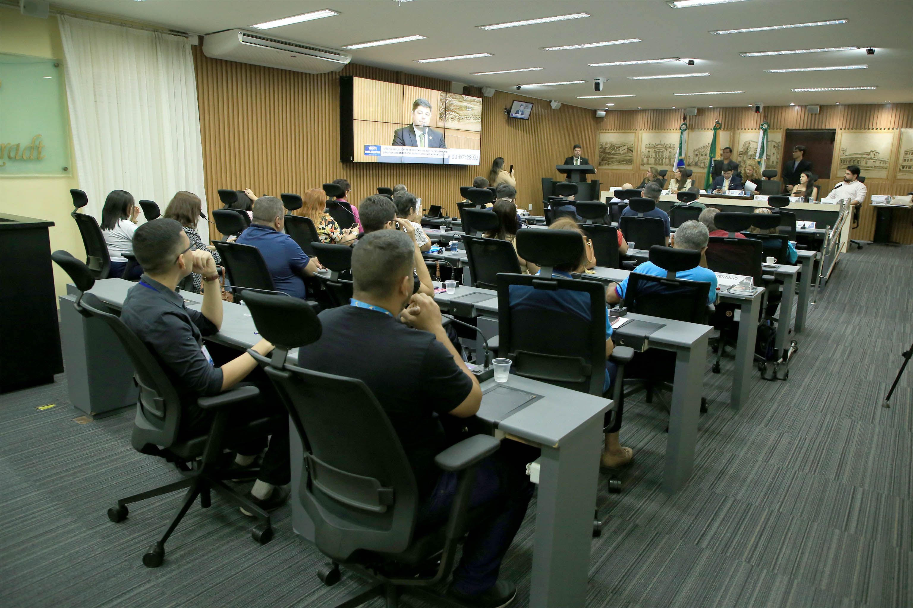 O plenário Érico Hackradt, da Câmara Municipal de Natal, foi palco para a discussão de políticas públicas voltadas para a juventude natalense na tarde desta quinta-feira (26). Foi a primeira audiência da Frente Parlamentar em Defesa dos Direitos da Criança e do Adolescente, presidida pelo vereador Pedro Henrique (PP), e cujo tema foi “Políticas Públicas para a Juventude e Adolescência em Natal: desafios, oportunidades e o papel do Conselho Municipal”. O evento contou com a presença de autoridades da Secretaria Municipal de Direitos Humanos de Natal, do Tribunal de Justiça do Rio Grande do Norte, do Conselho Estadual da Juventude do RN, além de representantes de organizações da sociedade civil e de adolescentes, que ocuparam as galerias da Casa Legislativa.